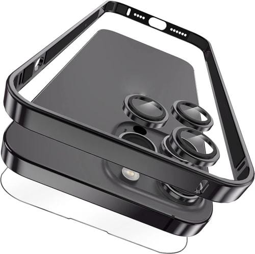 Marco de Metal Ultrafino + Lente + Juego de Protección para iPhone 14 Pro Max con Película (Negro)