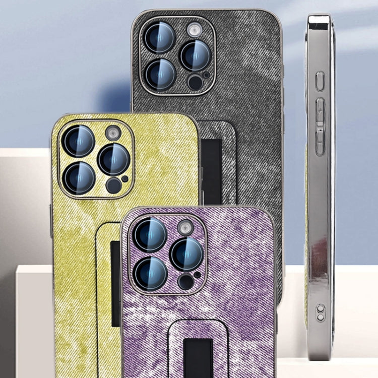 Funda para iPhone 14 Pro Max Patrón de Mezclilla Caja de Teléfono de Enfriamiento con Soporte Push-Pull Galvanizado (Gris)