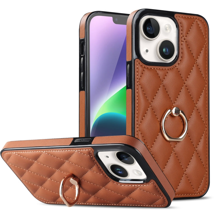 Funda para teléfono Rhombic para iPhone 14 PU Cuero con soporte para anillo (Marrón)
