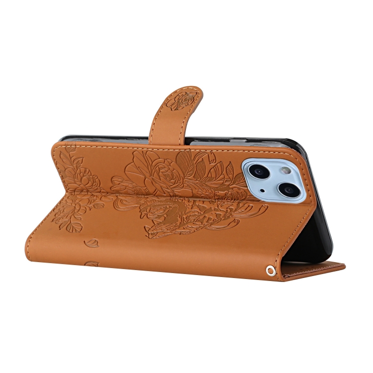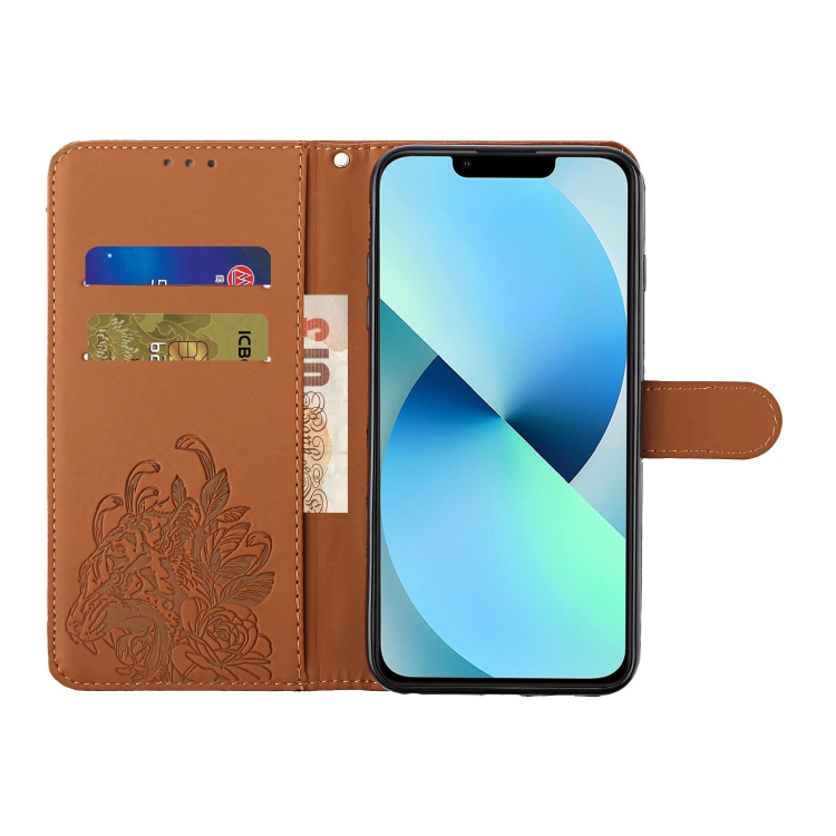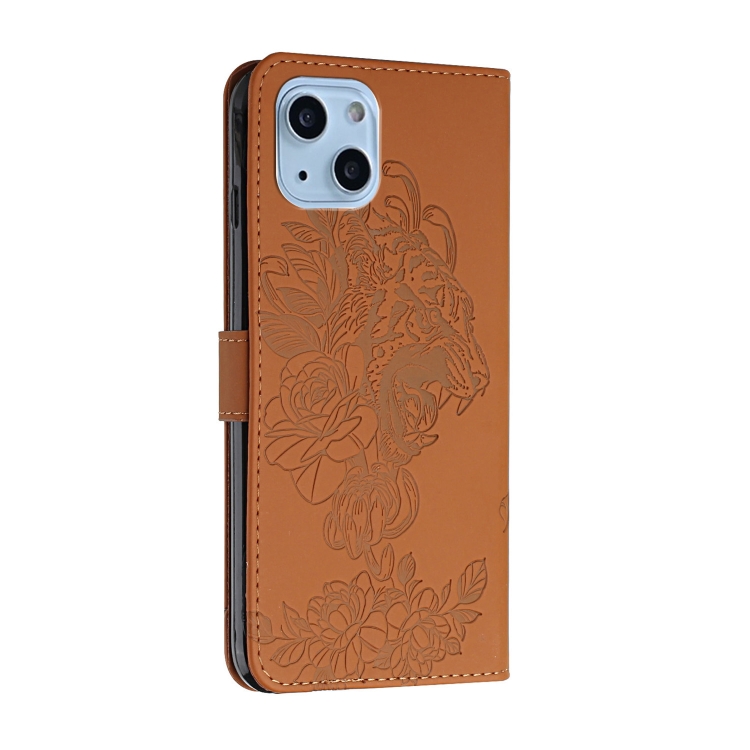 Funda de Cuero iPhone 14 Tiger Flower Repujado Protección Teléfono (Marrón)