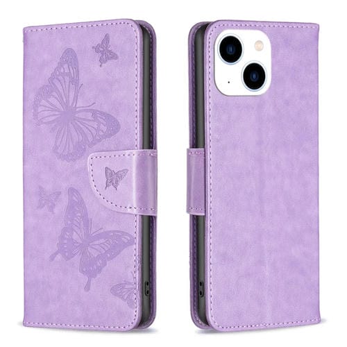 Funda de Cuero para iPhone 15 Estampado en Relieve Dos Mariposas (Púrpura)