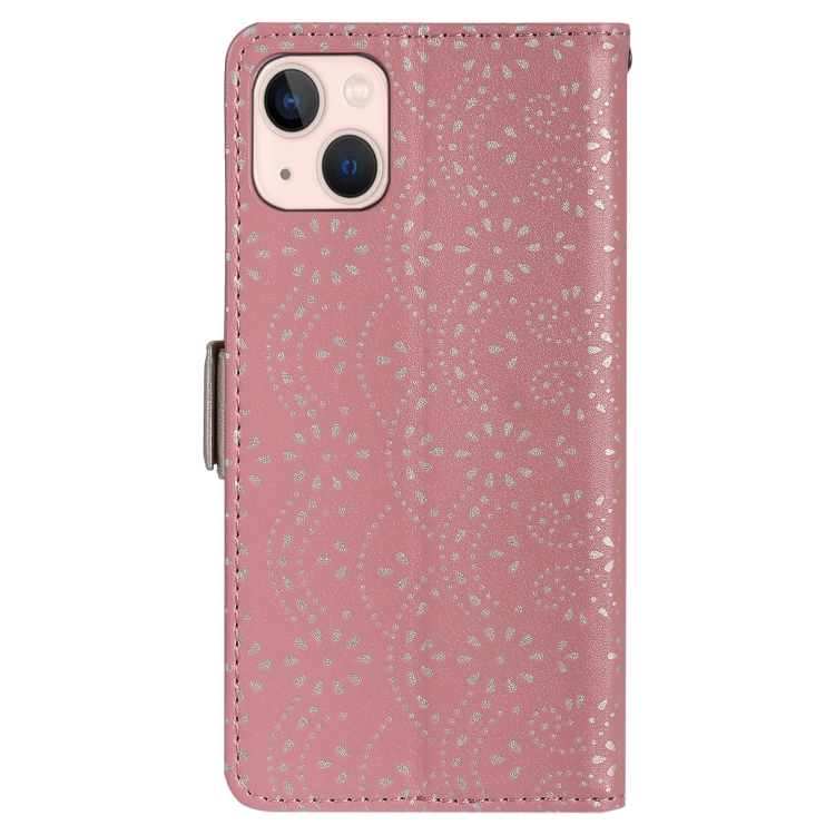 Funda de Cuero para iPhone 15 con Cremallera y Doble Botón con Patrón de Encaje y Cordón (Oro Rosa)