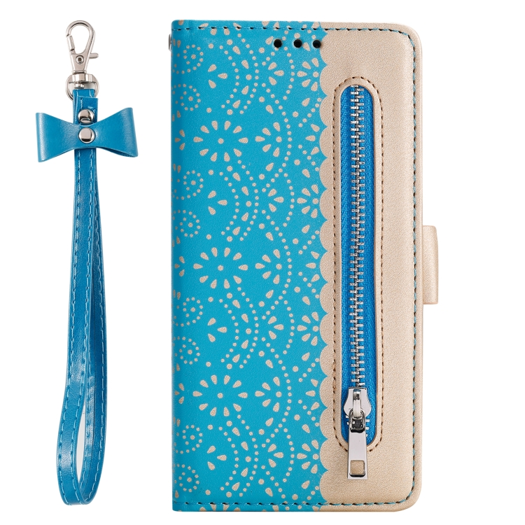 Funda para iPhone 15 Patrón de Encaje Botón Doble Cremallera de Cuero con Cordón (Azul)