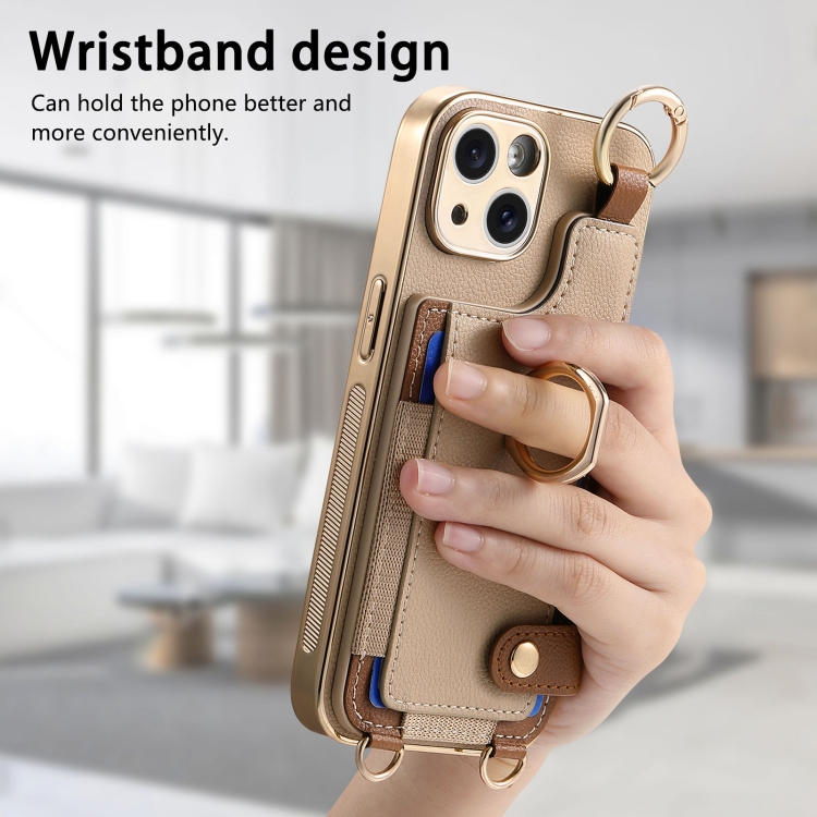 Estuche para Teléfono iPhone 15 Plus con Bolsa para Tarjeta Anillo y Lazo para Colgar (Caqui)
