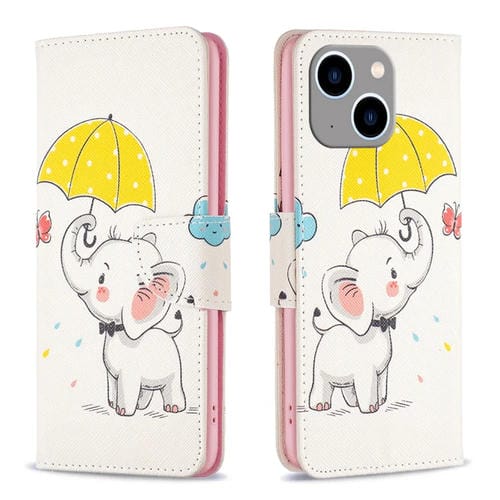 Funda de Cuero Flip para iPhone 15 Plus Patrón Dibujo Coloreado (Paraguas Elefante)