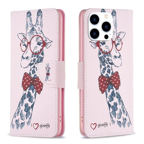 Estuche para teléfono iPhone 15 Pro Cuero con patrón de dibujo coloreado (Jirafa)