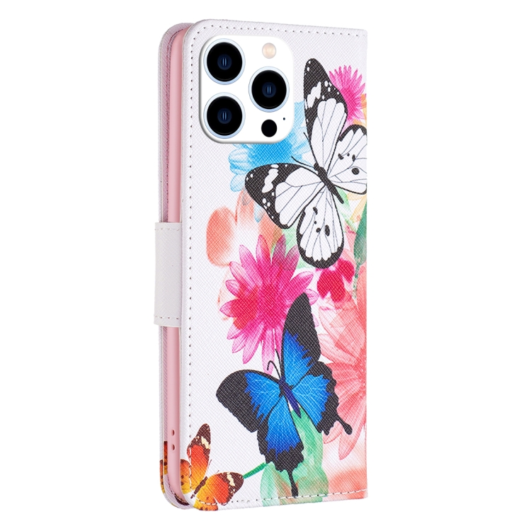 Estuche para teléfono iPhone 15 Pro Cuero con patrón de dibujo coloreado (Mariposas)