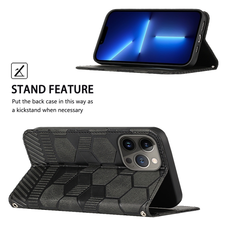 Funda de teléfono iPhone 15 Pro tapa cuero magnético textura fútbol (Negro)
