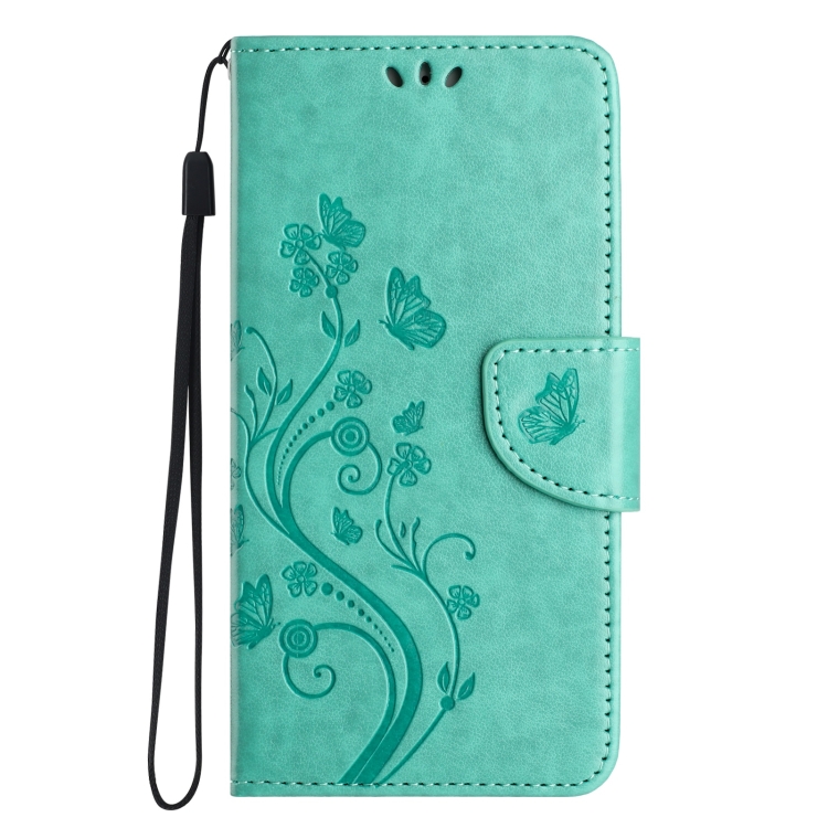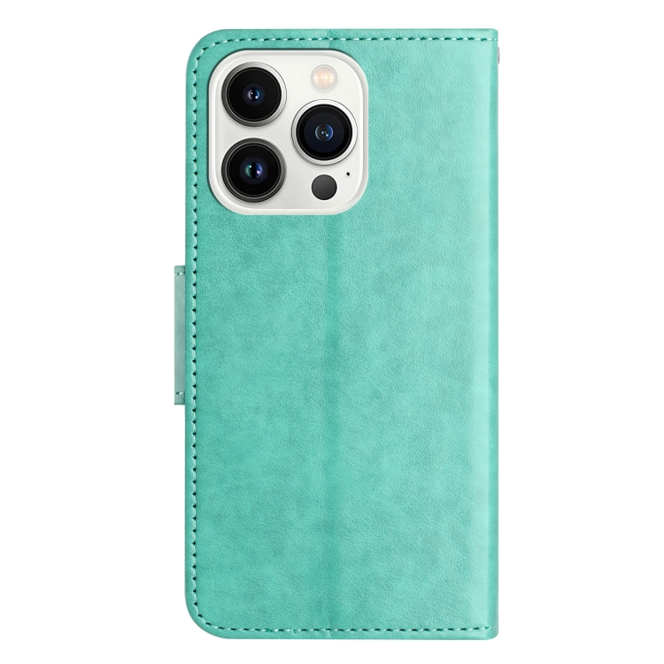 Funda de teléfono iPhone 15 Pro cuero con tapa patrón flores mariposa (Verde)