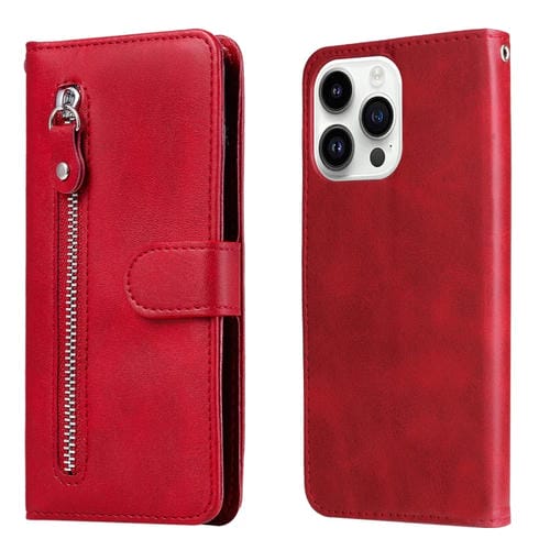 Funda para teléfono iPhone 15 Pro Max Becerro Textura Cremallera Cuero (Rojo)