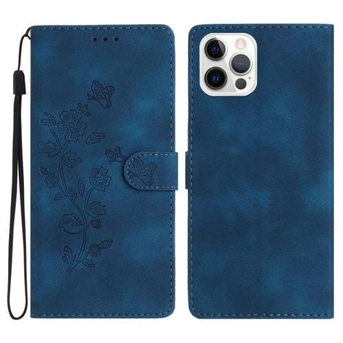 Funda de Cuero para iPhone 15 Pro Max Flor Mariposa Relieve Patrón (Azul)