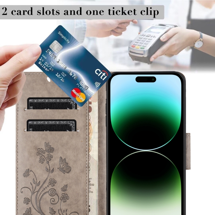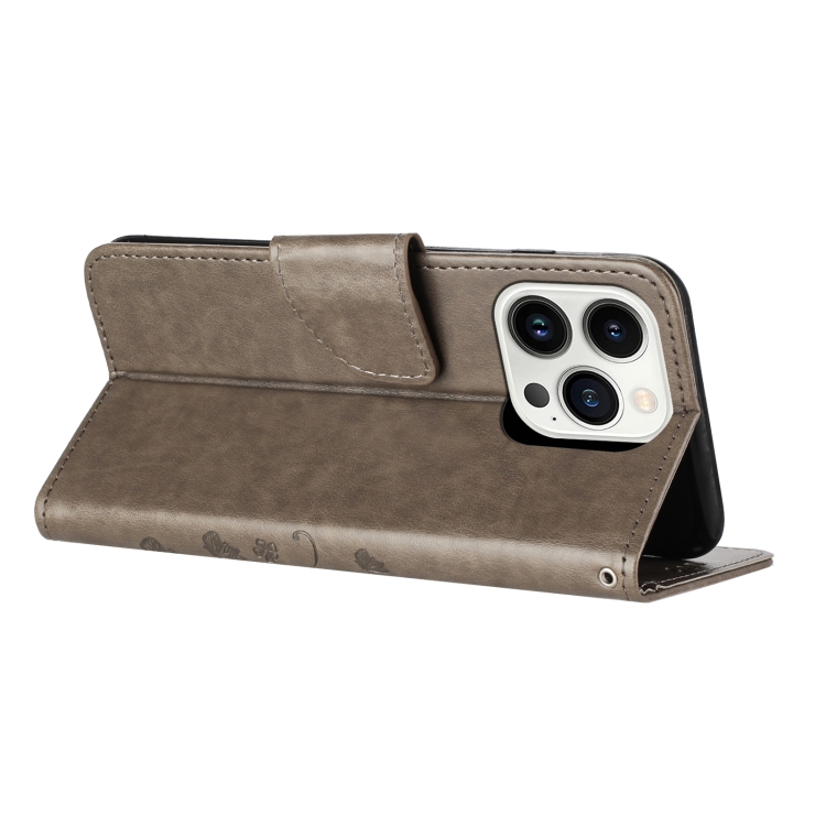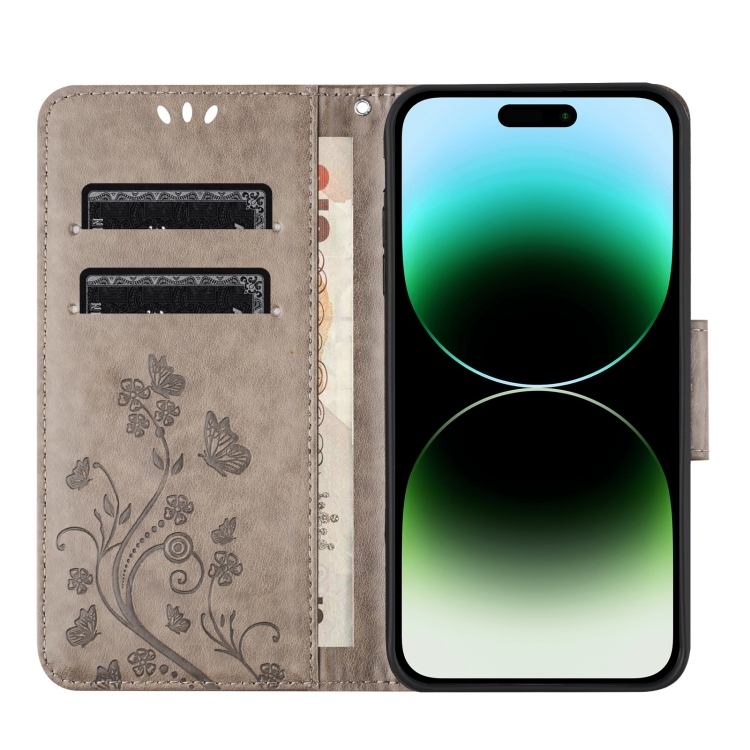 Funda de Teléfono Cuero iPhone 15 Pro Max con Tapa y Patrón de Flores de Mariposa (Gris)