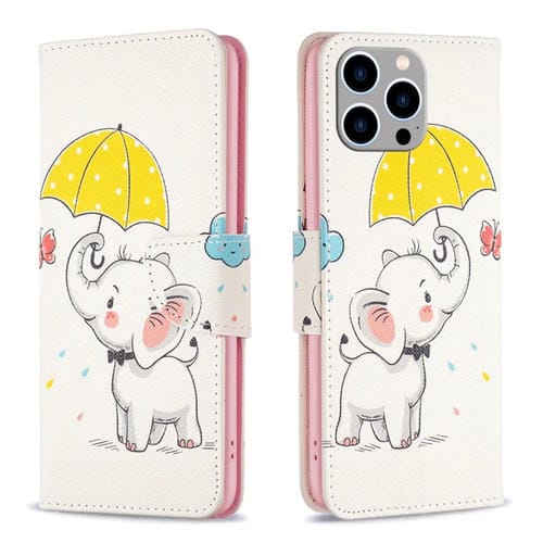 Funda de Cuero Flip para iPhone 15 Pro Max Patrón Dibujo Coloreado (Paraguas Elefante)