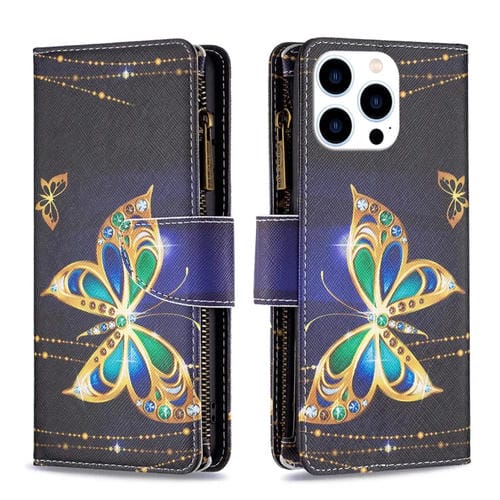 Funda de cuero para iPhone 15 Pro con cremallera y patrón de dibujo coloreado (Mariposa Grande)