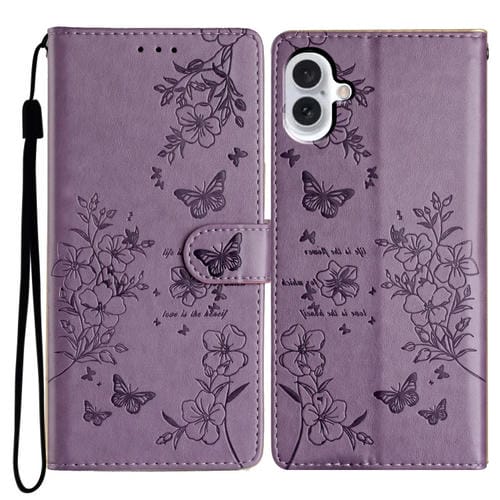 Funda para Teléfono iPhone 16 Plus Cuero Relieve Flor de Amor y Mariposa (Púrpura)