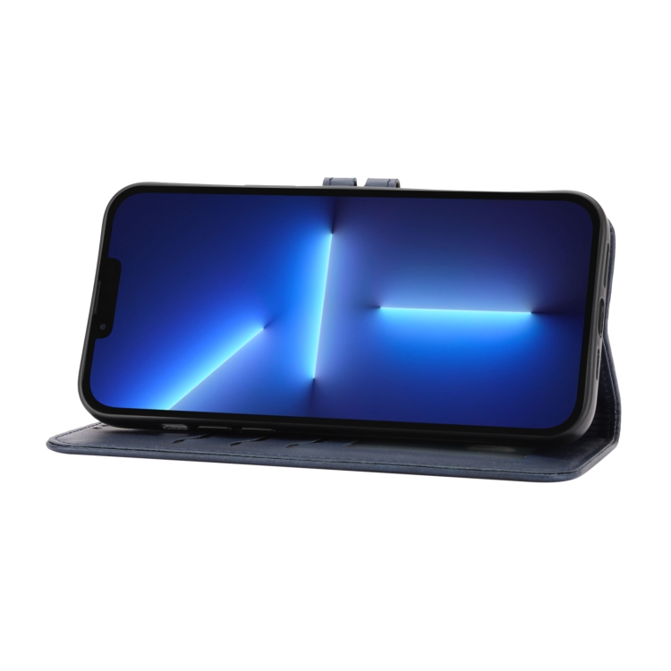 Funda para Teléfono iPhone 16 Pro Max Cuero con Tapa y Patrón de Gato Feliz en Relieve (Azul)