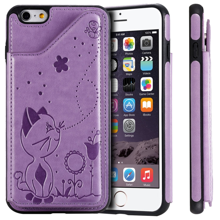 Estuche protector para iPhone 6 Plus Cat Bee con estampado en relieve, ranuras para tarjetas y marco de fotos (Morado)