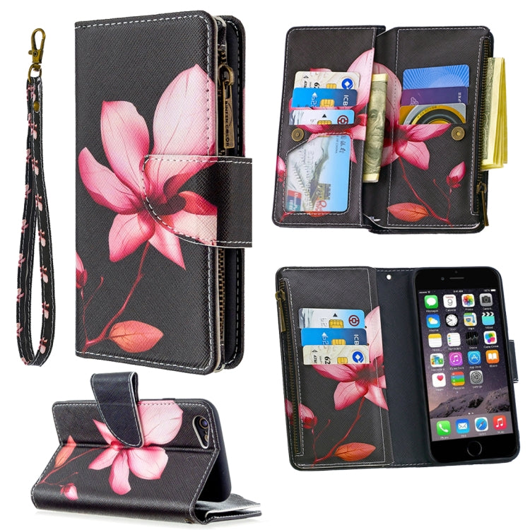 Funda de cuero iPhone 6S y 6 Lotus con patrón de dibujo, cremallera, tapa horizontal, soporte y ranuras para tarjetas