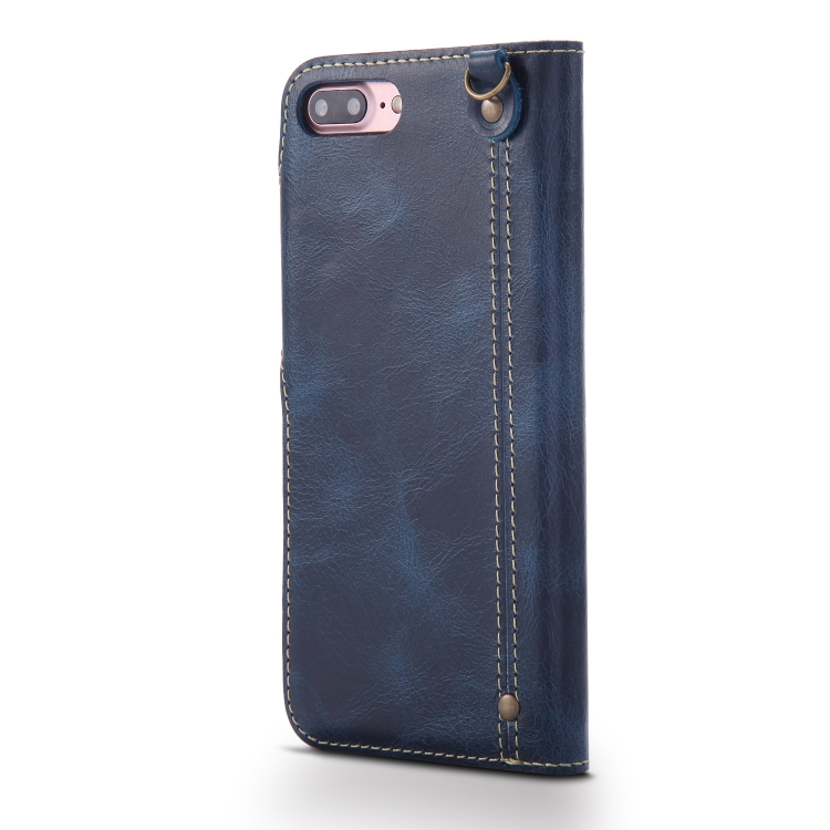 Funda para iPhone 7 Plus y 8 Plus Denior Oil Wax Piel de Vaca con Botón Magnético y Tapa Horizontal (Azul Oscuro)