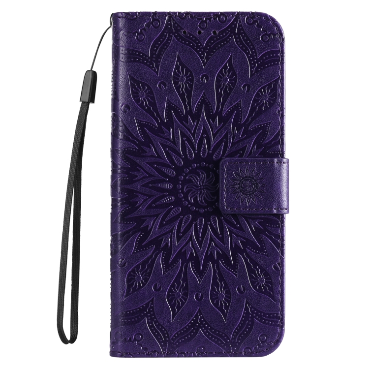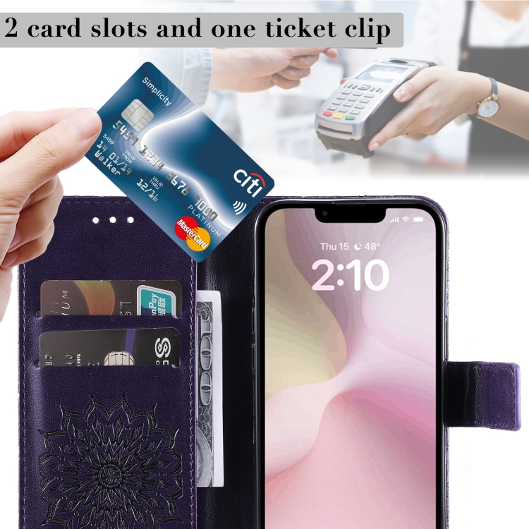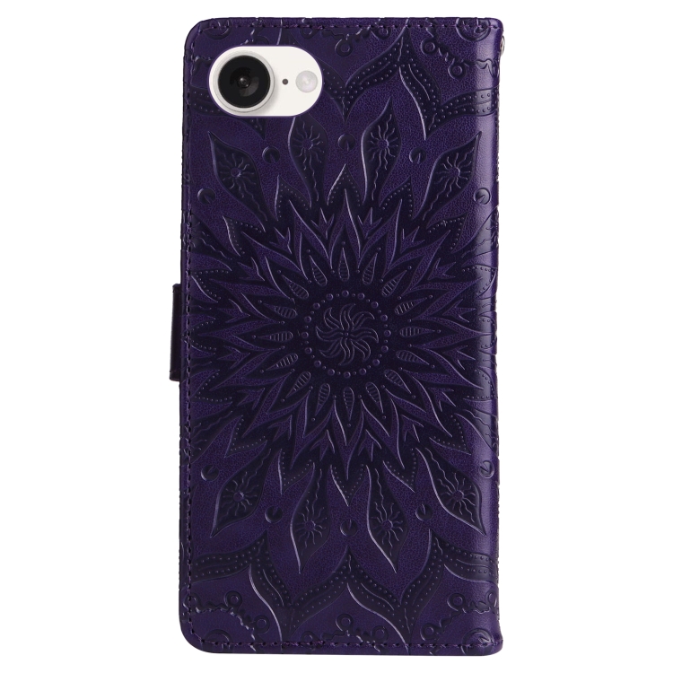Funda de Cuero con Tapa para iPhone 16E Estampado Girasoles en Relieve (Morado)