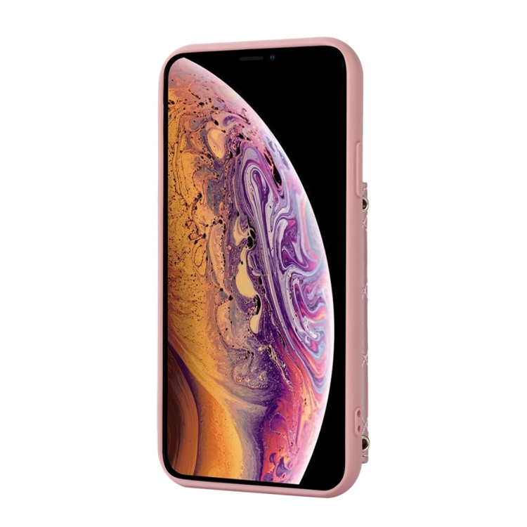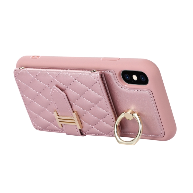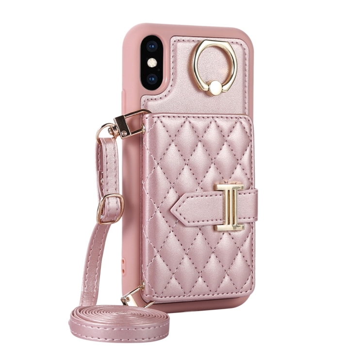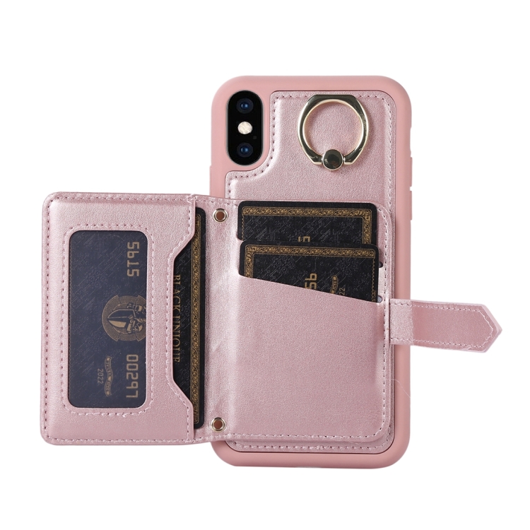 Funda para Teléfono iPhone X / Xs Bolsa de Tarjeta Horizontal con Soporte de Anillo y Doble Cordón (Oro Rosa)