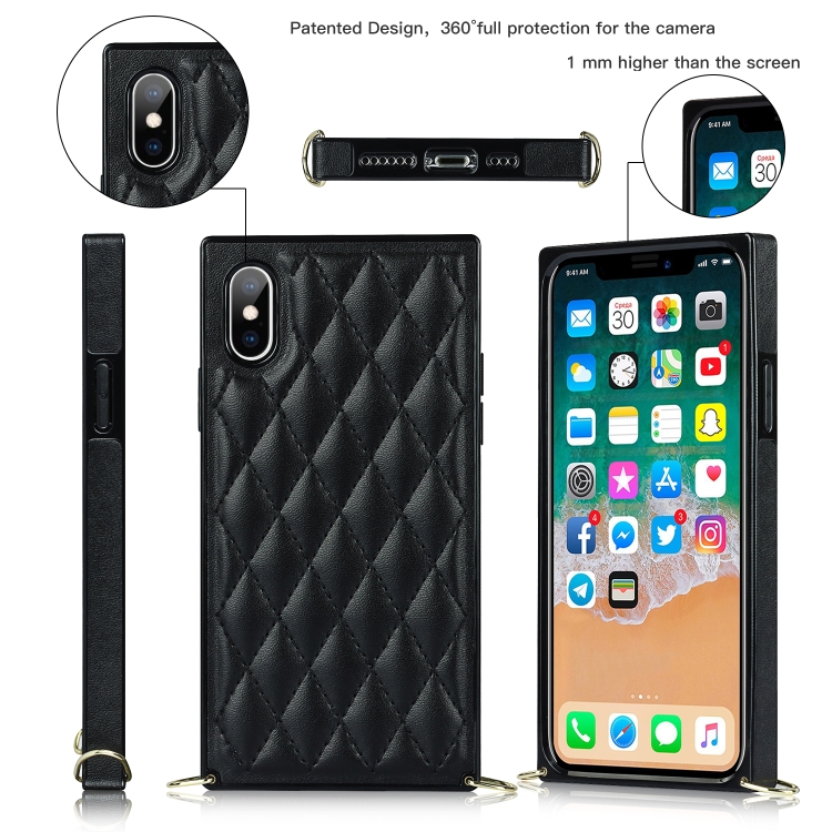 Estuche para iPhone X Xs Cuero de Microfibra TPU Patrón Rómbico a Prueba de Golpes con Cadena Cruzada (Negro)