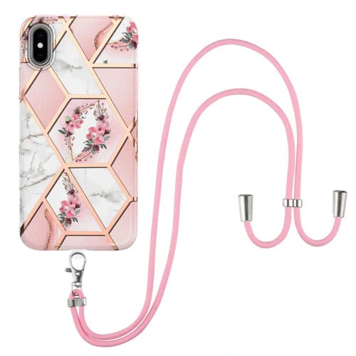 Estuche TPU para iPhone X Xs Galvanoplastia Empalme Mármol Patrón de Flores a Prueba de Golpes con Cordón (Flor Rosa)
