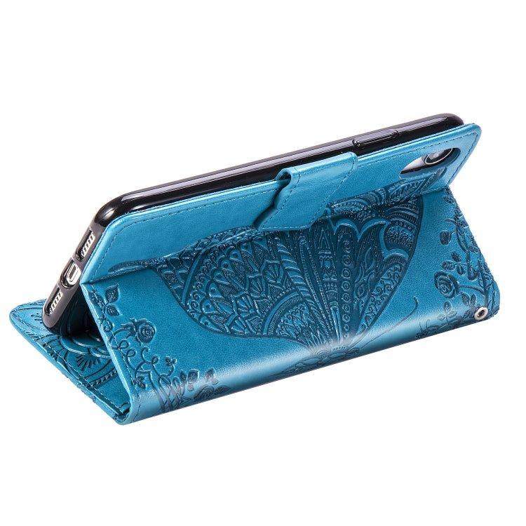Estuche de Cuero para iPhone Xr Butterfly Love Flowers con Tapa Horizontal, Soporte, Ranuras para Tarjetas, Billetera y Cordón (Azul)