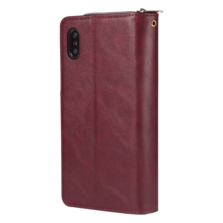 Funda Cartera para iPhone Xr Cuero de Pu con Cremallera Tapa Horizontal Soporte 9 Ranuras Billetera Cordón Marco de Fotos (Rojo Vino)