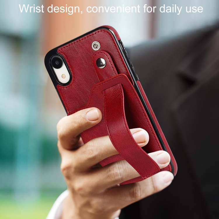 Funda para iPhone Xr Crazy Horse Texture Cuero TPU + PU a Prueba de Golpes con Ranura para Tarjeta y Correa para la Muñeca (Rojo)