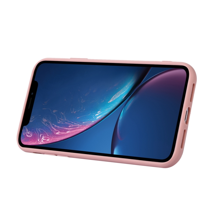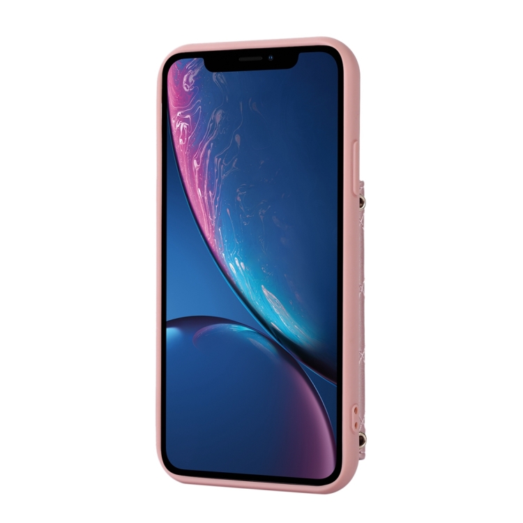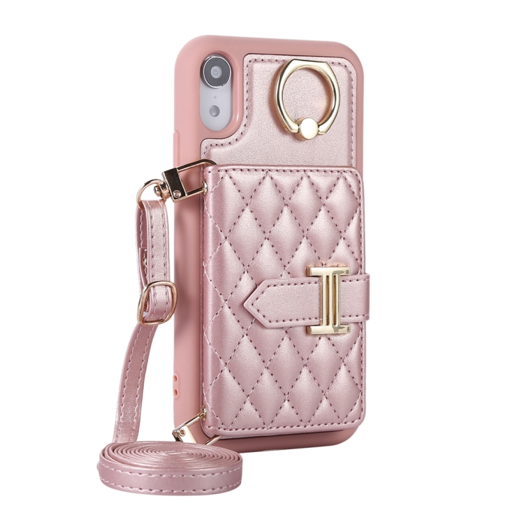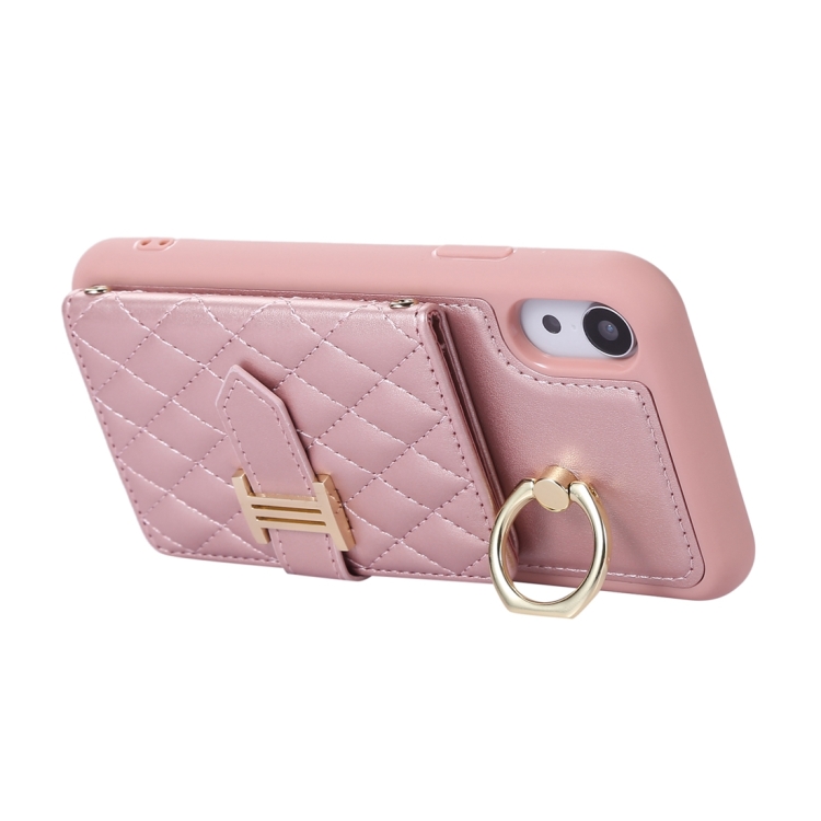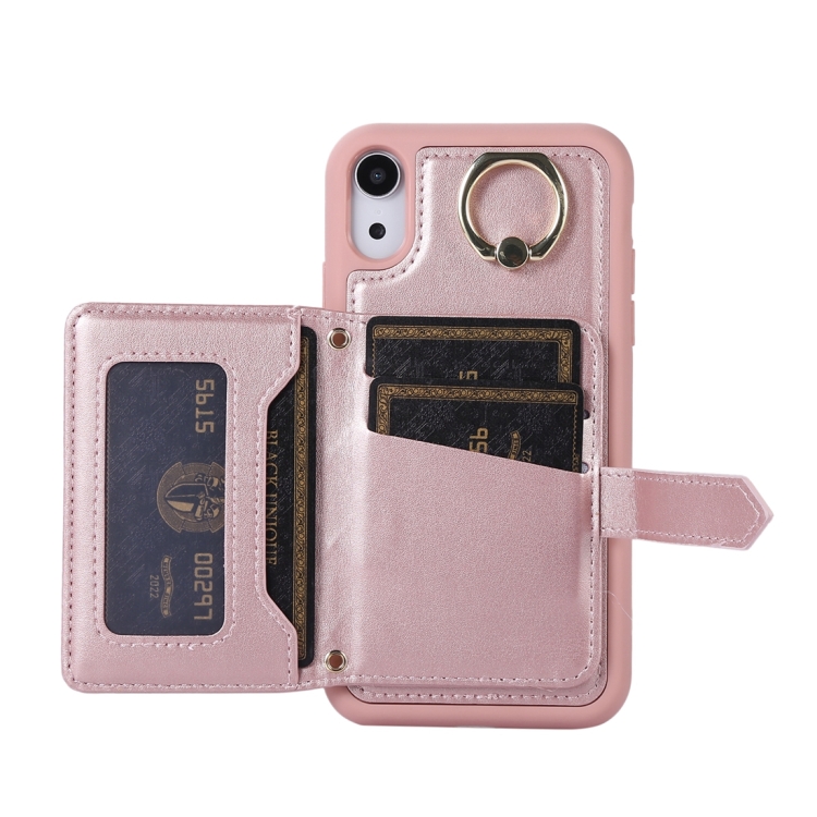 Estuche para teléfono iPhone Xr con soporte de anillo y bolsa de tarjeta horizontal con cordón doble (Oro Rosa)