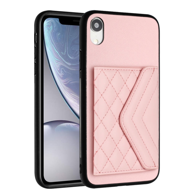 Estuche para Teléfono iPhone Xr con Bolsa para Tarjetas Rfid Textura Rómbica y Cordón Largo (Oro Rosa)