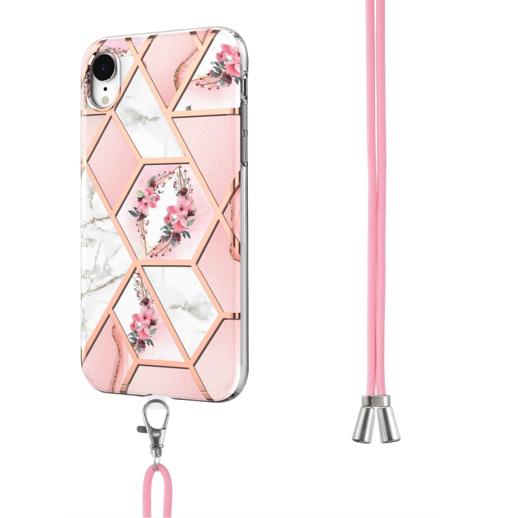 Estuche TPU para iPhone Xr Galvanoplastia Empalme Mármol Patrón de Flores a Prueba de Golpes con Cordón (Flor Rosa)