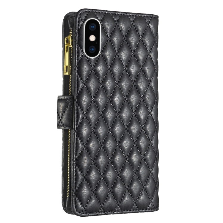 Funda para iPhone Xs Max Diamond Lattice Zipper Wallet de Cuero con Tapa (Negro)