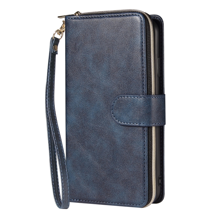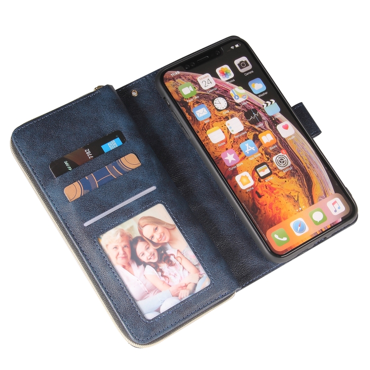 Funda para iPhone Xs Max Zipper Wallet Bag Cuero PU Tapa Horizontal Soporte 9 Ranuras Tarjetas Billetera Cordón Marco Fotos (Azul)