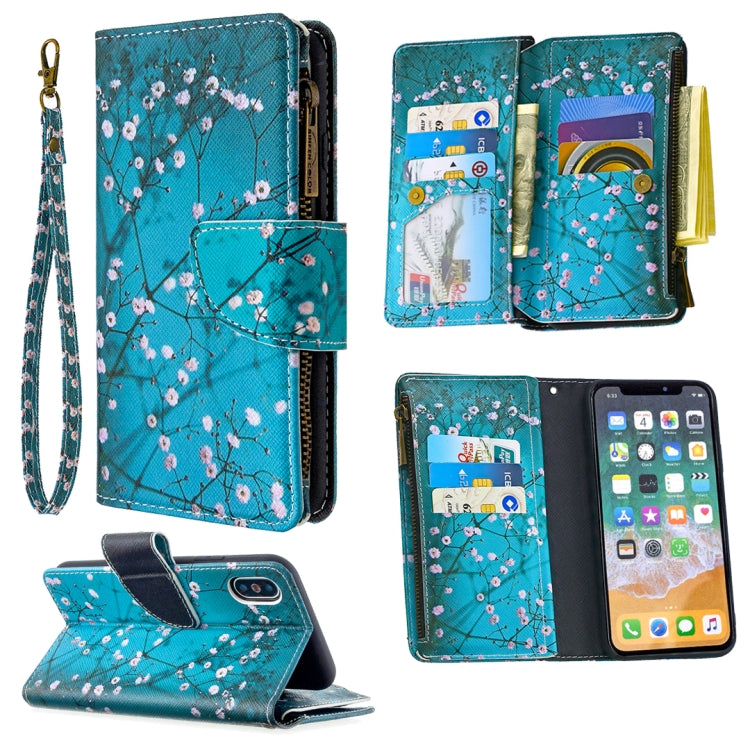 Funda de Cuero iPhone Xs X con Tapa Horizontal Soporte Ranuras Tarjetas Billetera (Plum Blossom)