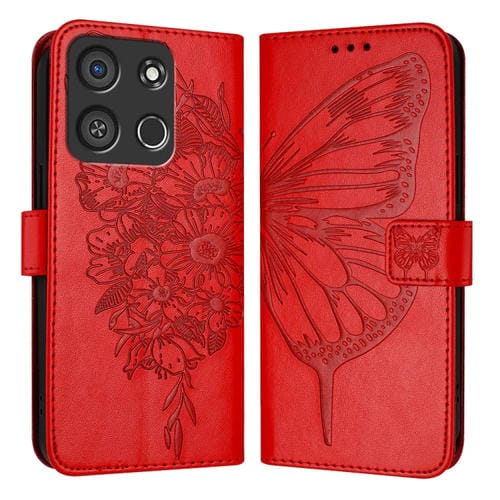 Funda de Cuero para Itel A05S con Mariposa en Relieve (Rojo)
