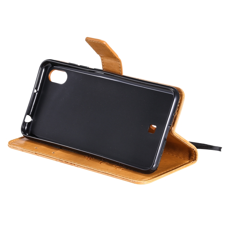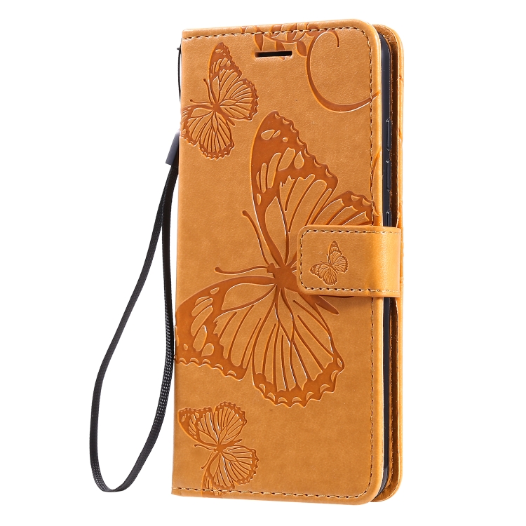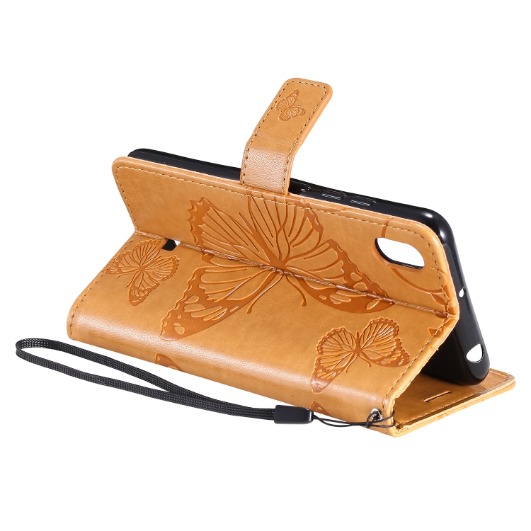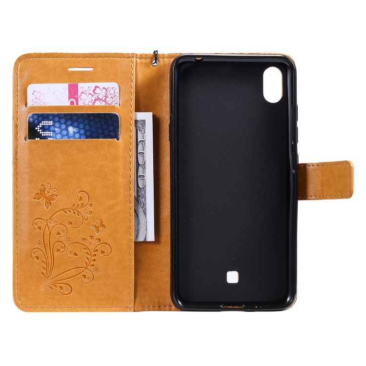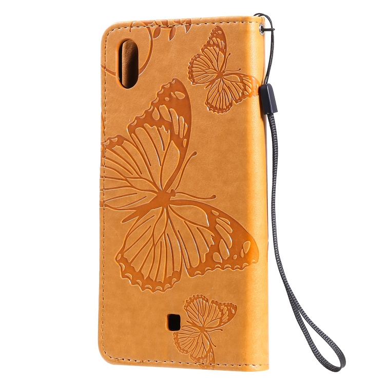 Estuche de Cuero PU para LG K20 con Tapa Horizontal, Estampado de Mariposa, Soporte, Ranuras para Tarjetas y Cordón (Amarillo)