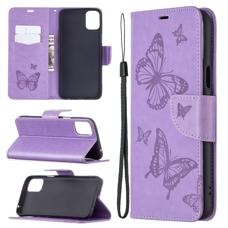Funda de Cuero para LG K42 con Dos Mariposas, Soporte, Ranura para Tarjeta y Billetera, Cordón (Púrpura)