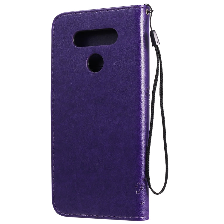 Funda de Cuero para LG K51 con Tapa Horizontal, Patrón Árbol y Gato, Soporte, Ranuras y Cordón (Púrpura)