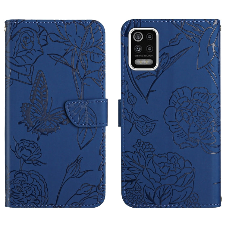 Funda de Cuero en Relieve Peonía Mariposa para LG K52 (Azul)