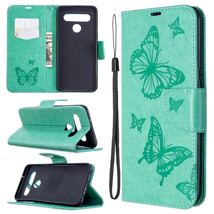 Funda de Cuero para LG K61 con Dos Mariposas en Relieve, Tapa Horizontal, Soporte, Ranura para Tarjeta y Billetera (Verde)