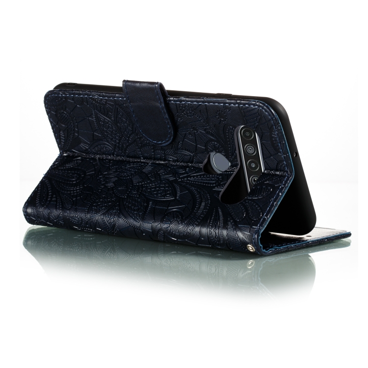 Funda de Cuero para LG K61 Lace Flower con Tapa Horizontal, Soporte, Ranuras para Tarjetas y Billetera (Azul Oscuro)