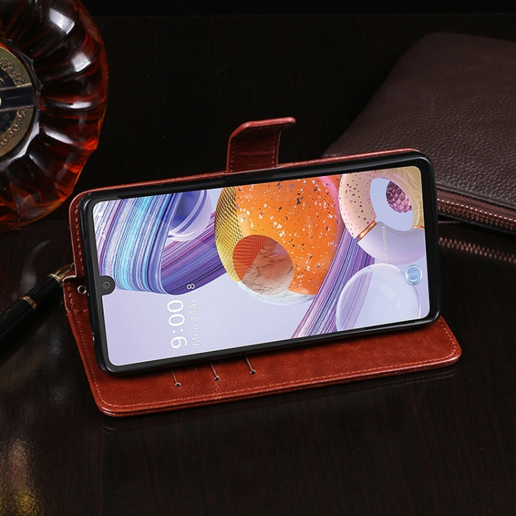 Funda de Cuero Idewei Crazy Horse para LG K71 con Tapa Horizontal, Soporte, Ranuras para Tarjetas y Billetera (Rosa Roja)