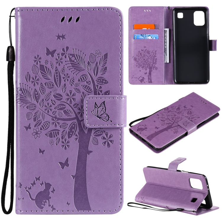 Funda de Cuero PU para LG K92 5G con Patrón Árbol y Gato, Soporte, Tarjetero y Cordón (Púrpura Claro)