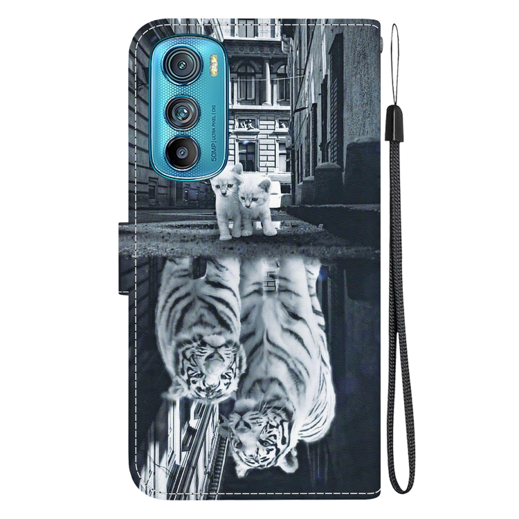 Funda de Cuero para Motorola Edge 30 con Dibujo Coloreado y Textura de Cristal (Reflejo de Tigre Gato)