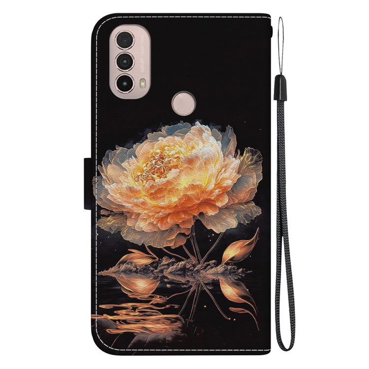 Funda de Cuero para Motorola Moto E20 E30 E40 con Dibujo Coloreado y Textura de Cristal (Peonía Dorada)