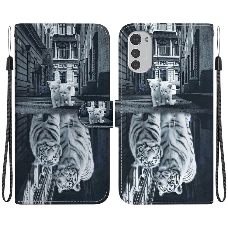 Funda de Cuero para Motorola Moto E32 con Dibujo Coloreado y Textura de Cristal (Reflejo de Tigre Gato)