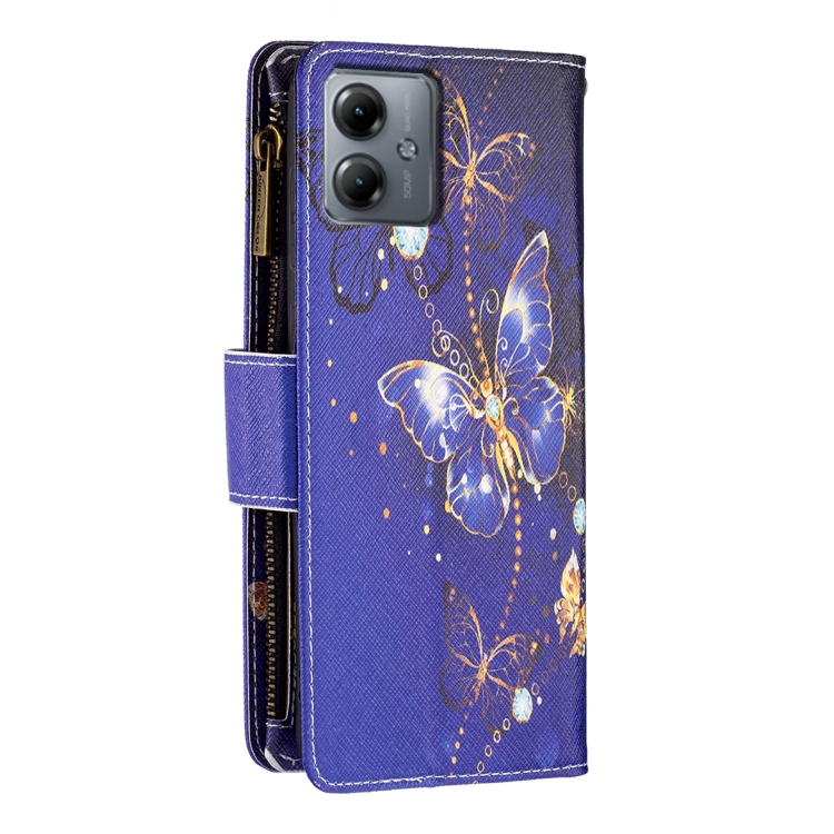 Funda de Cuero para Motorola Moto G14 4G con Cremallera y Dibujo Mariposa (Púrpura)