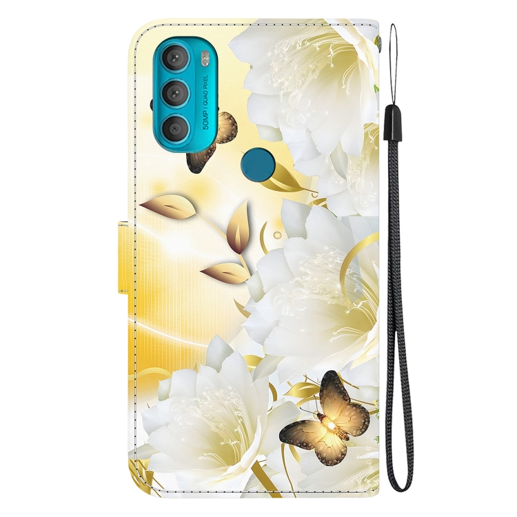Funda de Cuero para Motorola Moto G71 con Dibujo Epiphyllum de Mariposa Dorada y Textura de Cristal